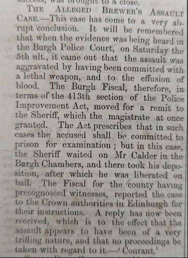 There was a reference to a court case where James Calder (1832-1917) owner of the brewery was alleged to have assaulted his business “partner” James Tait McNellan (1818-1885).